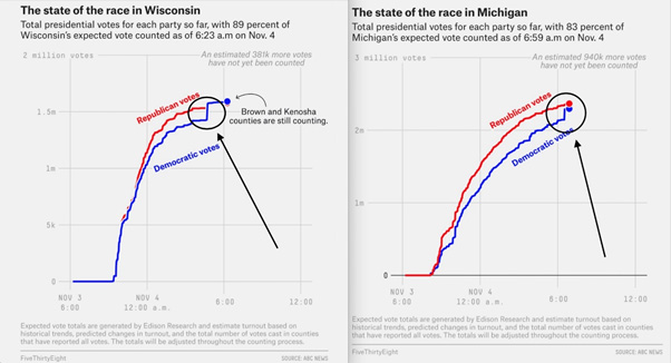V Wisconsin-u je Trump imel pri 90% preštetih glasov 100.000 glasov prednosti (1.472.119 : 1.355.944). Ta prednost pa se je ob prispetju poštnih glasovnic, ki so zamujale po več ur, povsem izničila. Štetje v Green Bay-u bi naj bilo ustavljeno zaradi tega, ker jim je »zmanjkalo črnila« (čeprav so tamkajšnjim pooblaščenim opazovalcem dejali, da jim je »zmanjkalo papirja«). Izgleda, da takoj ko so vsi odšli spat, so Demokrati v urbanih središčih od nekod pobrali zadostno količino glasovnic, da izbrišejo Trumpovo prednost v naslednjem jutru. Kar je še posebej bizarno glede na to, da bi to pomenilo, da je republikanski kandidat za Predstavniško hišo v tej zvezni državi dobil več glasov (1.620.435) kot Trump (1.610.001). Kar je praktično nemogoče, saj je Trump neizmerljivo bolj priljubljen pri republikanskih volivcih kot katerikoli drugi republikanski politik. Prav tako bi to pomenilo, da je Biden dobil več glasov (1.630.535) kot demokratski kandidat Predstavniške hiše (1.525.836), čeprav ni nikoli po nobeni anketi beležil nadpovprečne podpore znotraj demokratske stranke.