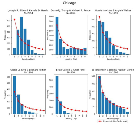 Biden-ove vsote glasov bi naj tudi kršile Benfordov zakon. Gre za orodje, ki ga v tujini že kar nekaj časa uporabljajo z namenom odkrivanja nepravilnosti v računovodskih izkazih. Vsi ostali kandidati po državah sledijo temu statističnemu zakonu, razen Biden, in to zgolj v ključnih dirkah. Spodaj je priložen test za iskanje podatkovne goljufije, ki ga uporablja državni oddelek in forenzični računovodje v ZDA