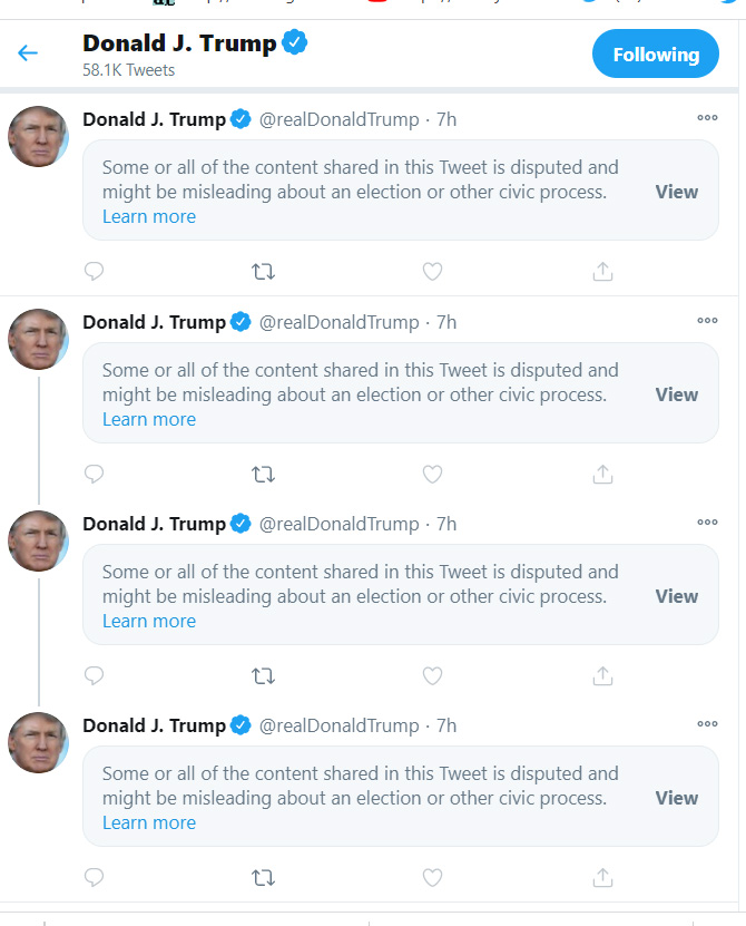 Zgodba pri »tehnoloških velikanih« (Big Tech) ni nič drugačna. Mediji socialnih omrežij povsem sodelujejo v tej prevari. Twitter prične cenzurirat Trumpove tweet-e, ki se nanašajo na volitve. (Spodaj en primer- twitter račun D. Trumpa danes)